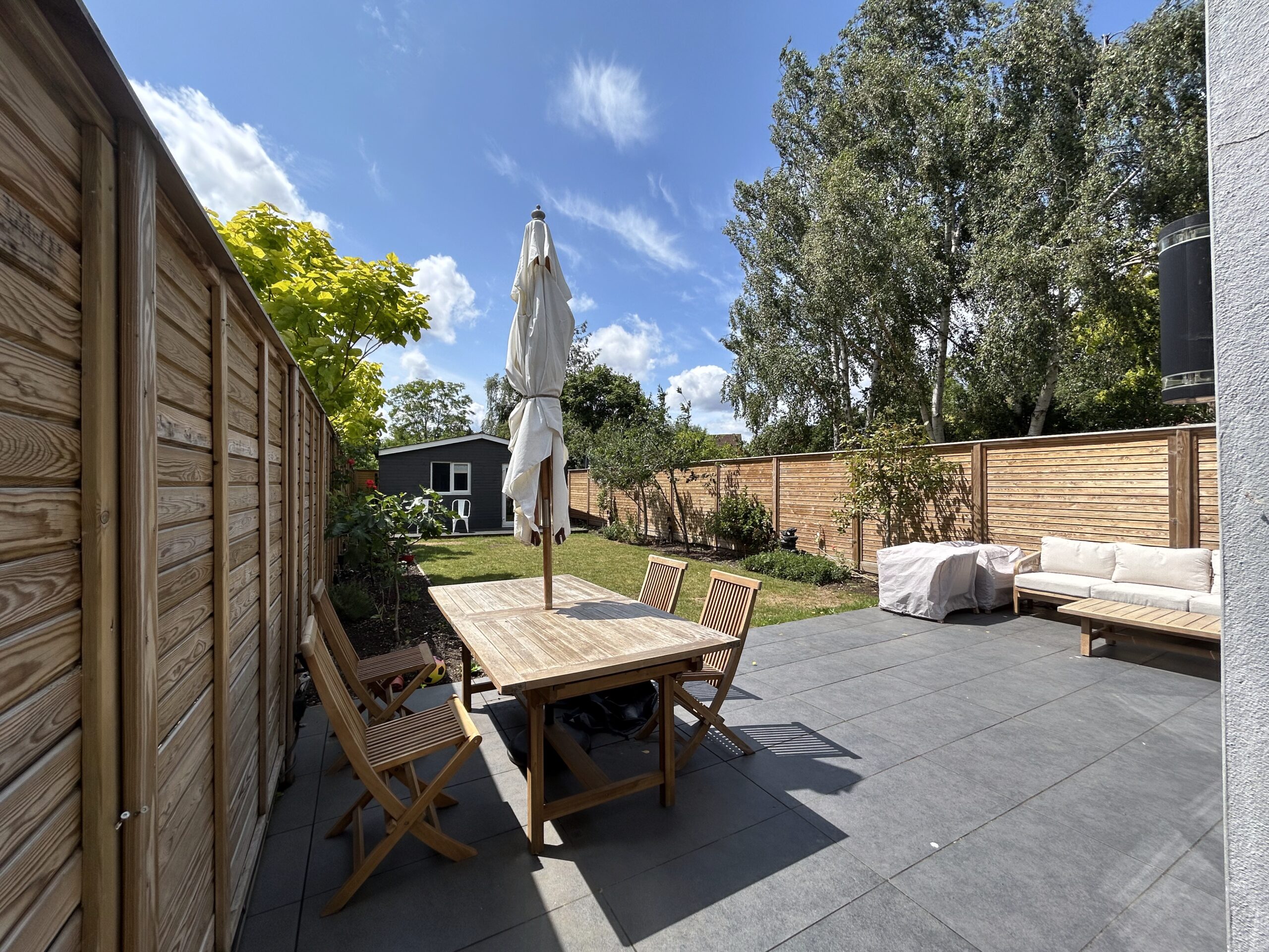 - Dull boundaries: despite high-quality horizontal wooden fencing panels, the garden lacks any notable points of interest. At the bottom of the garden, the studio, with grey wood cladding, contrasts with the high-specs in the house, which features beautiful bi-folds opening onto the garden.